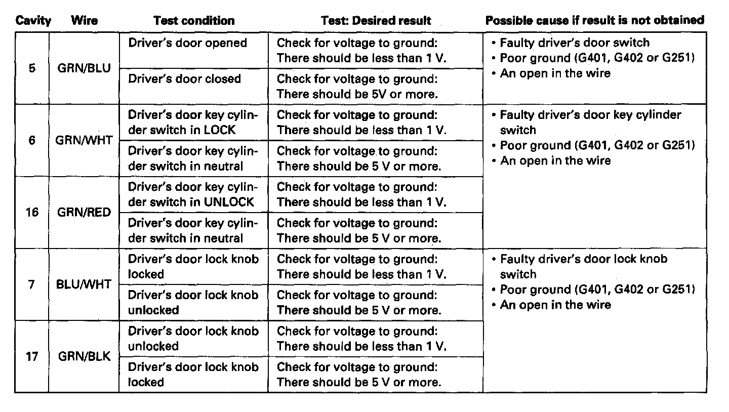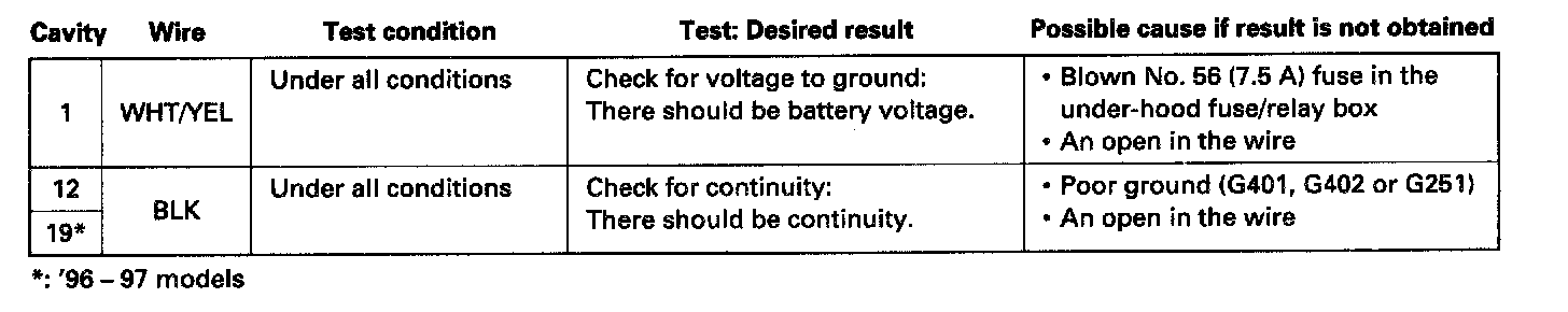- If the terminals look OK, make the input tests as shown in the table at the connector.