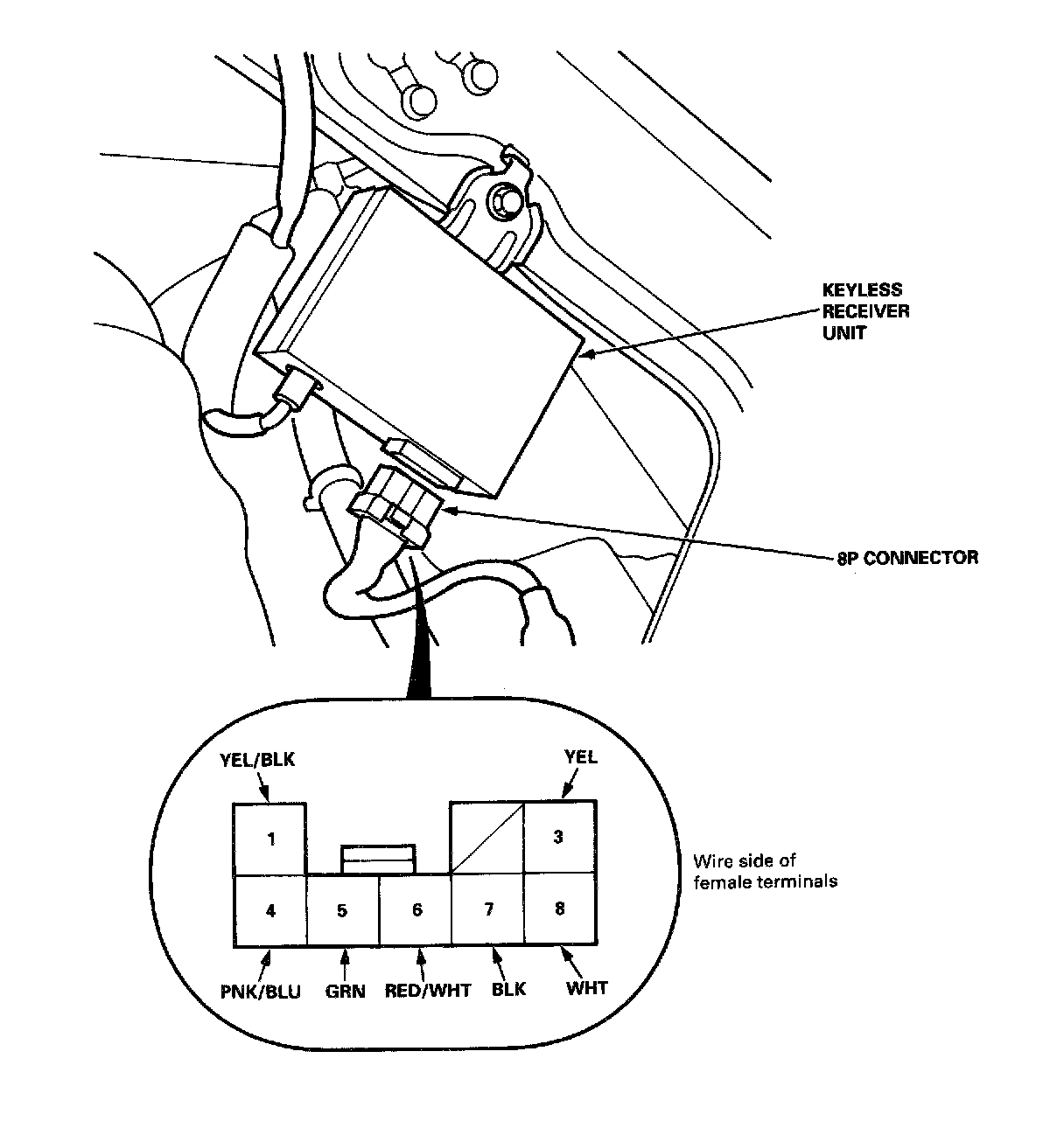 1. Remove the rear seat.2. Disconnect the 8P connector from the keyless receiver unit.