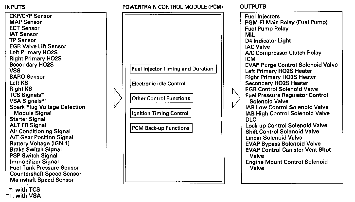 When an abnormality occurs in a signal from a sensor, the PCM ignores that signal and assumes a pre-programmed value for that sensor that allows the engine to continue to run.