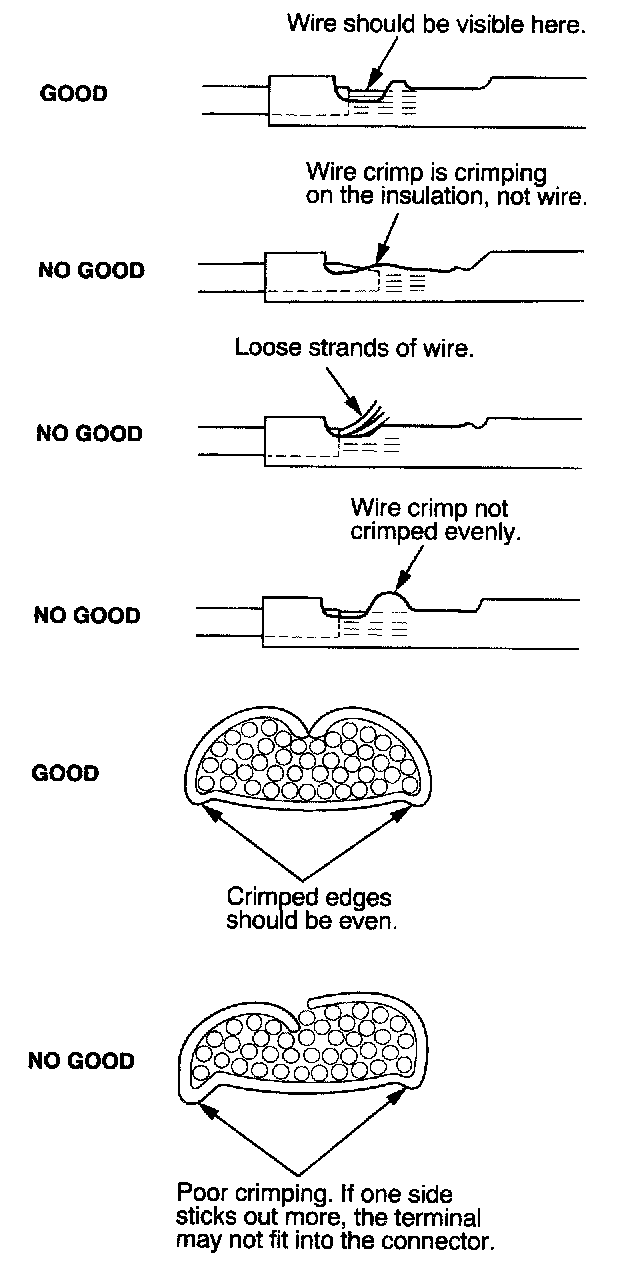 8. Inspect the quality of the wire crimp. If it has any of the following NO GOOD crimps, cut it off and start over.