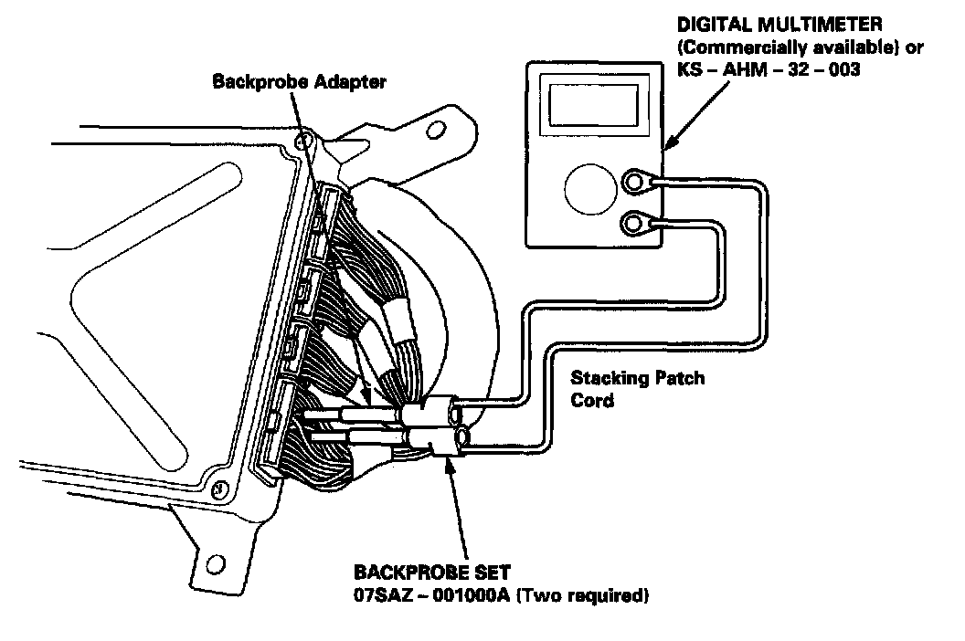 If the inspection for a particular code requires voltage or resistance checks at the PCM connectors, remove the right door sill molding. Pull the carpet back to expose the PCM. Unbolt the PCM cover, and connect the backprobe sets and a digital multimeter as described below. Check the system according to the procedure described for the appropriate code(s) listed.
