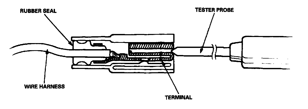 - Bring the tester probe into contact with the terminal from the terminal side of wire harness connectors in the engine compartment. For female connectors, lust touch lightly with the tester probe and do not insert the probe.