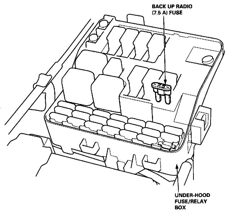 - Turn the ignition switch OFF. Remove the BACK UP RADIO (7.5 A) fuse from the under-hood fuse/relay box for 10 seconds.