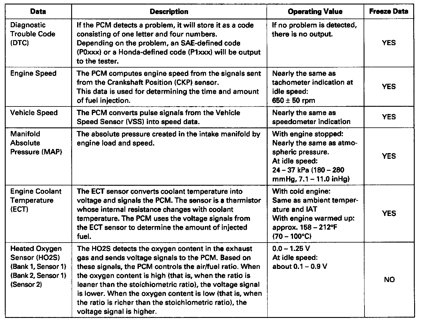 You can retrieve data from the PCM by connecting the OBD II scan tool or the Honda PGM Tester to the Data Link Connector (DLC). The items listed in the table below conform to SAE recommended practice. The Honda PGM Tester also reads data beyond that recommended by SAE so that this data may help you find the causes of intermittent problems.