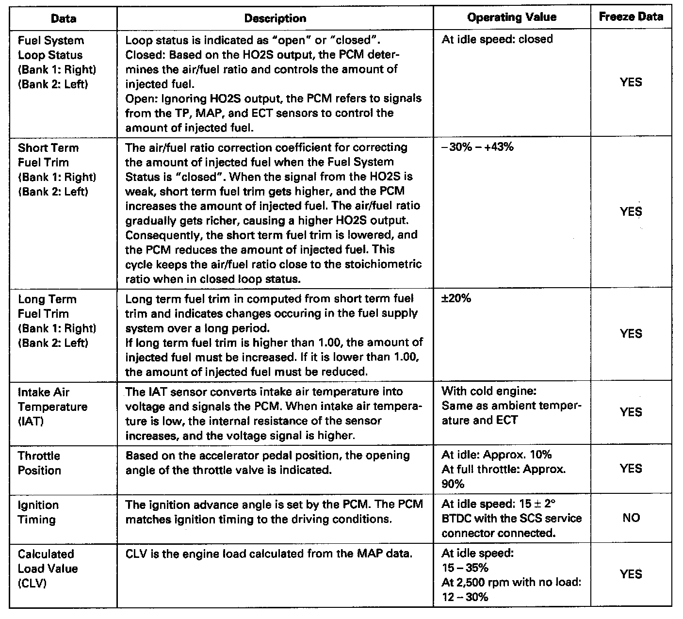 - The "operating values" listed are approximate and may vary depending on the environment and the individual vehicle.
