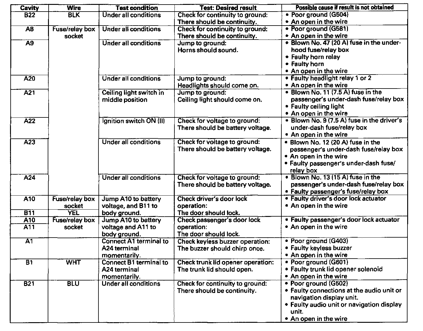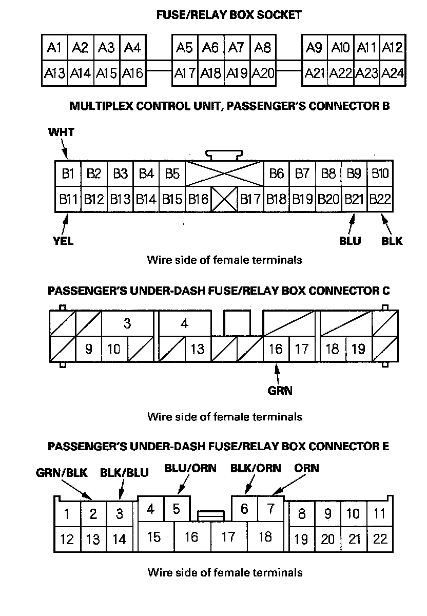 8. With the passenger's multiplex control unit still disconnected, make these input tests at the connectors and the passenger's under-dash fuse/relay box sockets.