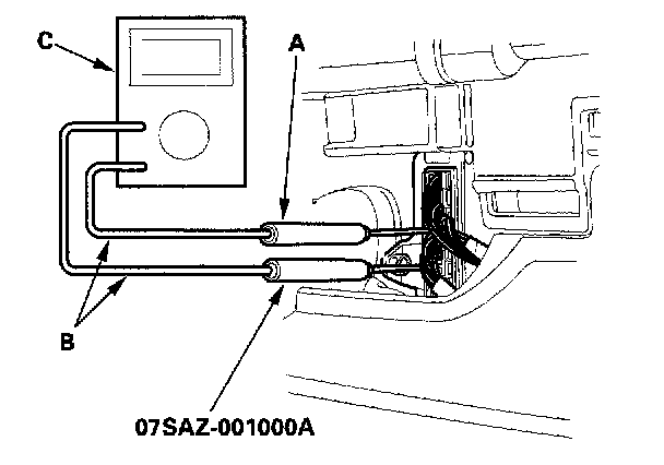 1. Connect the backprobe adapters (A) to the stacking patch cords (B), and connect the cords to a digital multimeter (C).
