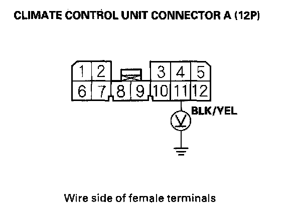 4. Measure the voltage between the No. 11 terminal of climate control unit connector A (12P) and body ground.