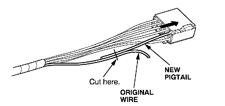 6. Lay the pigtail and the original wire side-by-side, and cut off both ends at once. If you are making more than one splice, do not cut each pigtail at the same location; the resulting "lump" of splice connectors would interfere with rewrapping the harness. Instead, cut the first pigtail close enough to the terminal so you will have room to make each remaining cut about 20 mm (3/4 inch) farther down on the next pigtail.