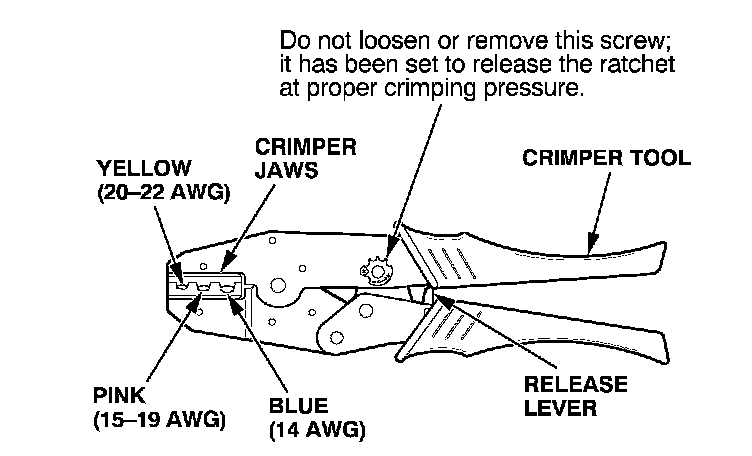 8. Put the splice connector in the proper size slot in the Crimper Tool, slide it to one end (where the flare begins), and close the crimper handles far enough to hold it in place. To release the ratchet mechanism at any point after the first click, squeeze the handles slightly and push the release lever, then let the handles open.