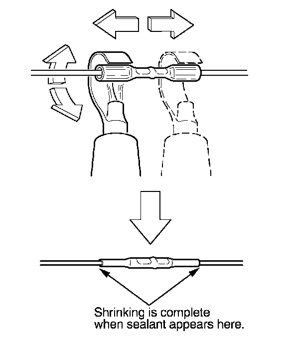 13. Plug in the heat gun, and turn it on. Start at the middle of the splice connector, and move the gun toward the ends as the tube shrinks. Apply heat evenly by rotating the curved heat spreader around the splice connector. Shrinking is complete when a small amount of sealant appears at each end of the tube.
