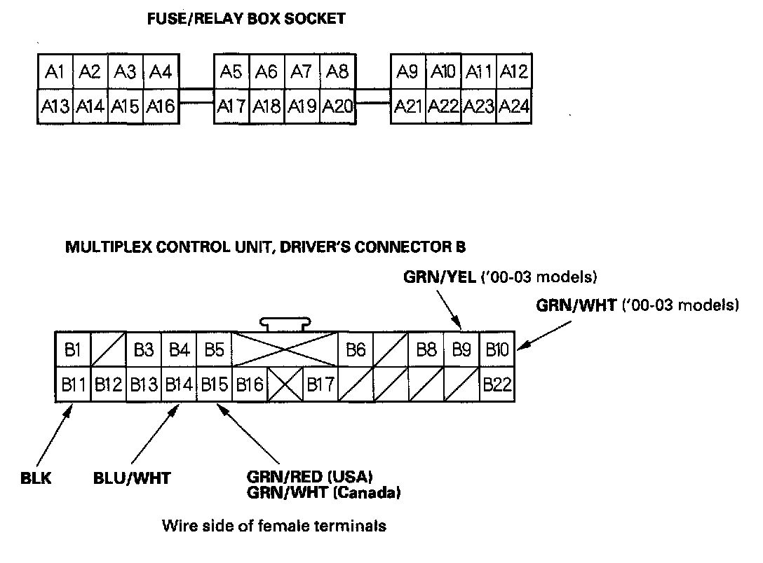 4. With the driver's [1][2]multiplex control unit still disconnected, make these input tests at the connector and driver's under-dash fuse/relay box sockets.