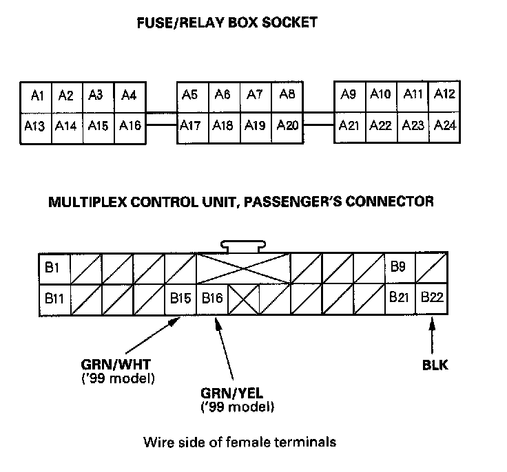 8. With the passenger's [1][2]multiplex control unit still disconnected, make these input tests at the connector and the passenger's under-dash fuse/relay box sockets.
