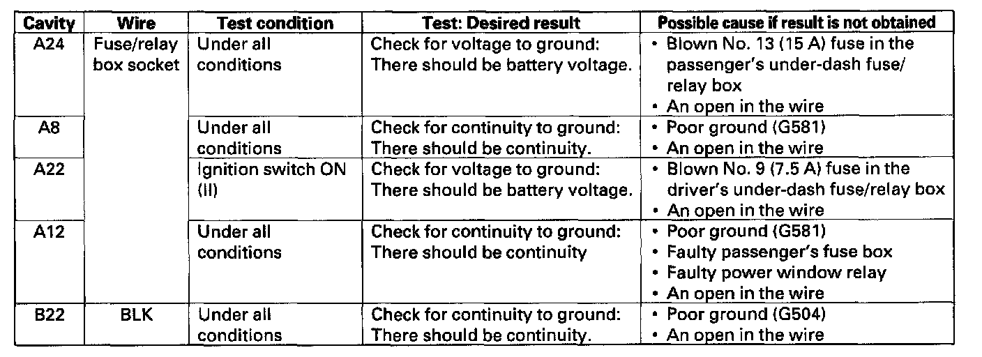 7. Make the following input tests at connector B and the passenger's under-dash fuse/relay box socket.