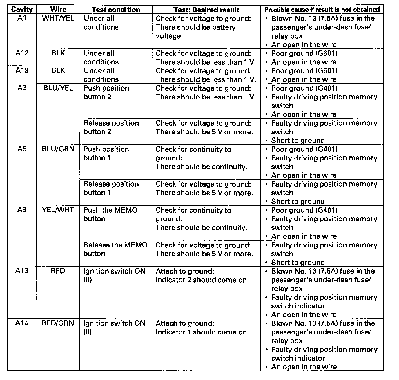 1. Before testing the driving position memory control functions, troubleshoot the multiplex control system.