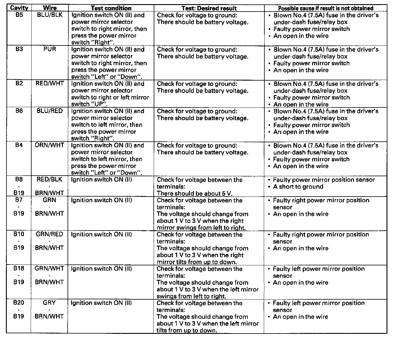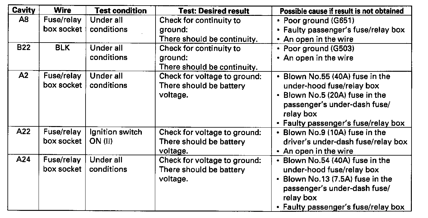 9. Reconnect the passenger's multiplex control unit to the passenger's under-dash fuse/relay box, and make these input tests at the appropriate connectors on the passenger's under-dash fuse/relay box.