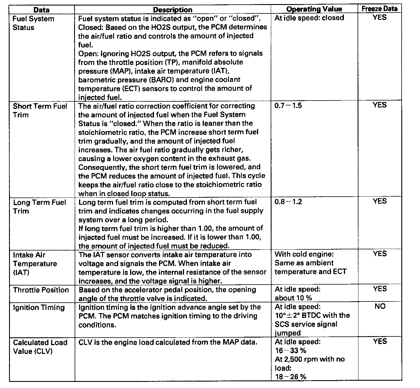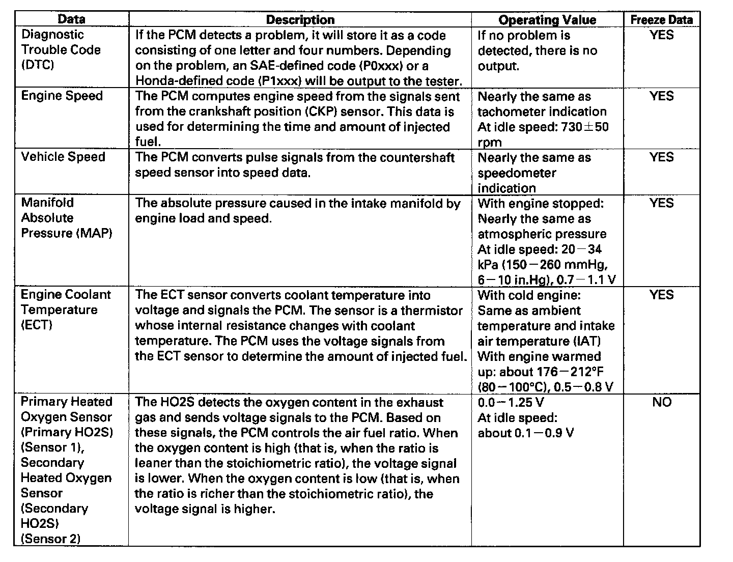 You can retrieve data from the PCM by connecting the OBD II scan tool or the Honda PGM Tester to the Data Link Connector (DLC). The items listed in the table below conform to SAE recommended practice. The Honda PGM Tester also reads data beyond that recommended by SAE to help you find the causes of intermittent problems.
