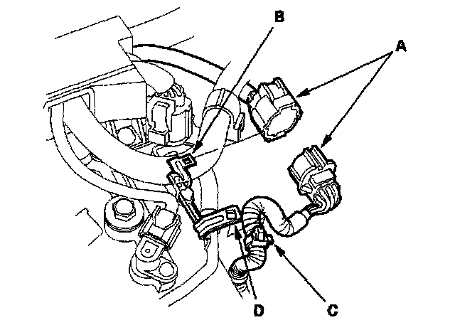5. Remove the clamp from the clamp bracket on the transmission housing, and remove the harness holder (A) from the end cover (B).