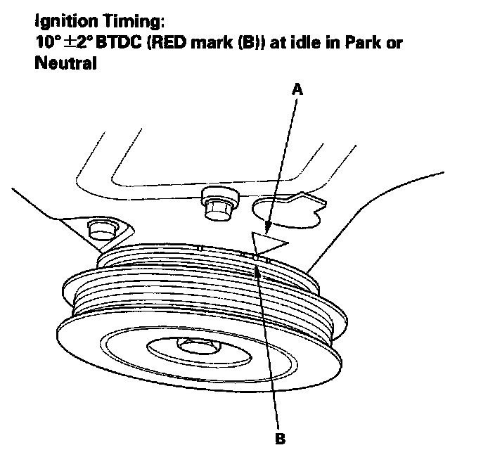 5. Point the light toward the pointer (A) on the timing belt cover. Check the ignition timing under no load condition: headlights, blower fan, rear window defogger, and air conditioner are not operating. If the ignition timing differs from the specification shown, check the cam timing, and the TDC and CKP sensors. If necessary, substitute a known-good powertrain control module (PCM), and recheck (PCM).
