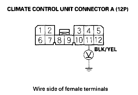 4. Measure the voltage between the No. 11 terminal of climate control unit connector A (12P) and body ground.