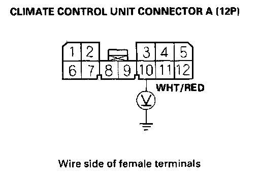 6. Measure the voltage between the No. 10 terminal of climate control unit connector A (12P) and body ground.
