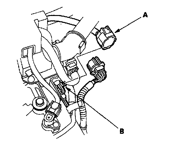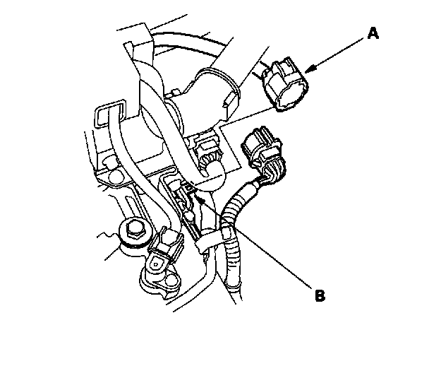 5. Remove the clamp from the harness clamp bracket on the transmission housing, and remove the harness clamp (A) from the end cover (B).