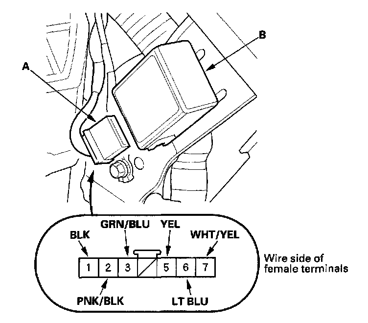 2. Disconnect the 7P connector (A) from the keyless receiver unit (B).