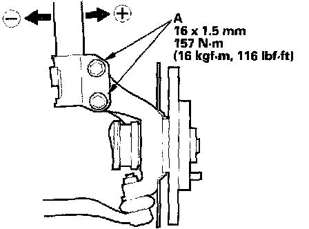 2. Loosen the flange nuts (A), and adjust the camber by moving the bottom of the damper within the range of the damper pinch bolt free play. Tighten the flange nuts to the specified torque.