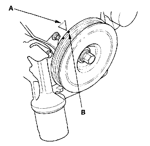 6. Aim the light toward the pointer (A) on the timing belt cover. Check the ignition timing under no load condition: headlights, blower fan, rear window defogger, and air conditioner are not operating.