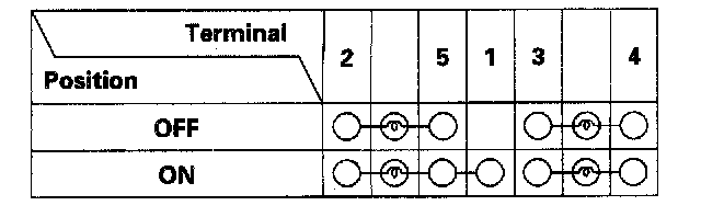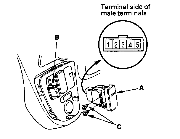 3. Check for continuity between the terminals in each switch position according to the table. If there is no continuity, check the illumination bulbs (C). If the bulbs are OK, replace the switch.