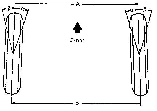 Toe-in is the turning of the front wheels. The actual amount of toe-in is normally a fraction of a degree. Toe-in is measured from the center of the tire treads or from the inside of the tires. The purpose of toe-in is to insure parallel rolling of the front wheels and to offset any small deflections of the wheel support system which occurs when the vehicle is rolling forward. Incorrect toe-in results in excessive toe-in and unstable steering. Toe-in is the last alignment to be set in the front end alignment procedure.