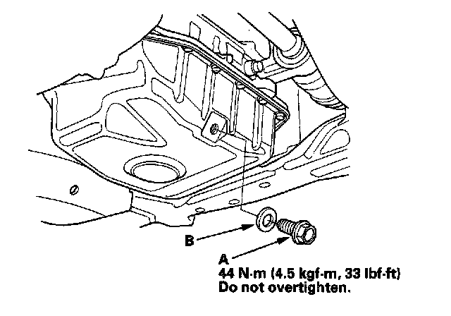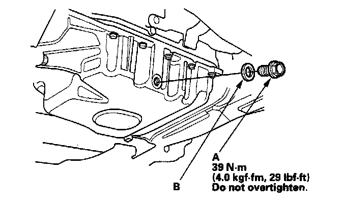 3. Reinstall the drain bolt with a new washer (B).