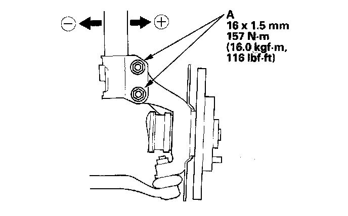 2. Loosen the flange nuts (A) and bolts, and adjust the camber by moving the bottom of the damper within the range of the damper pinch bolt free play. Tighten the flange nuts to the specified torque.