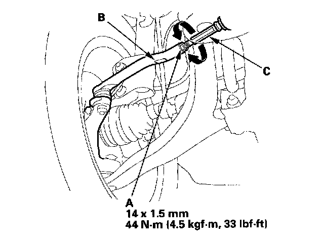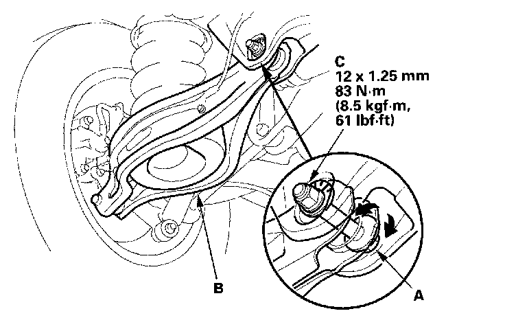 3. Hold the adjusting bolt (A) on the rear lower arm B. and loosen the self-locking nut (C).