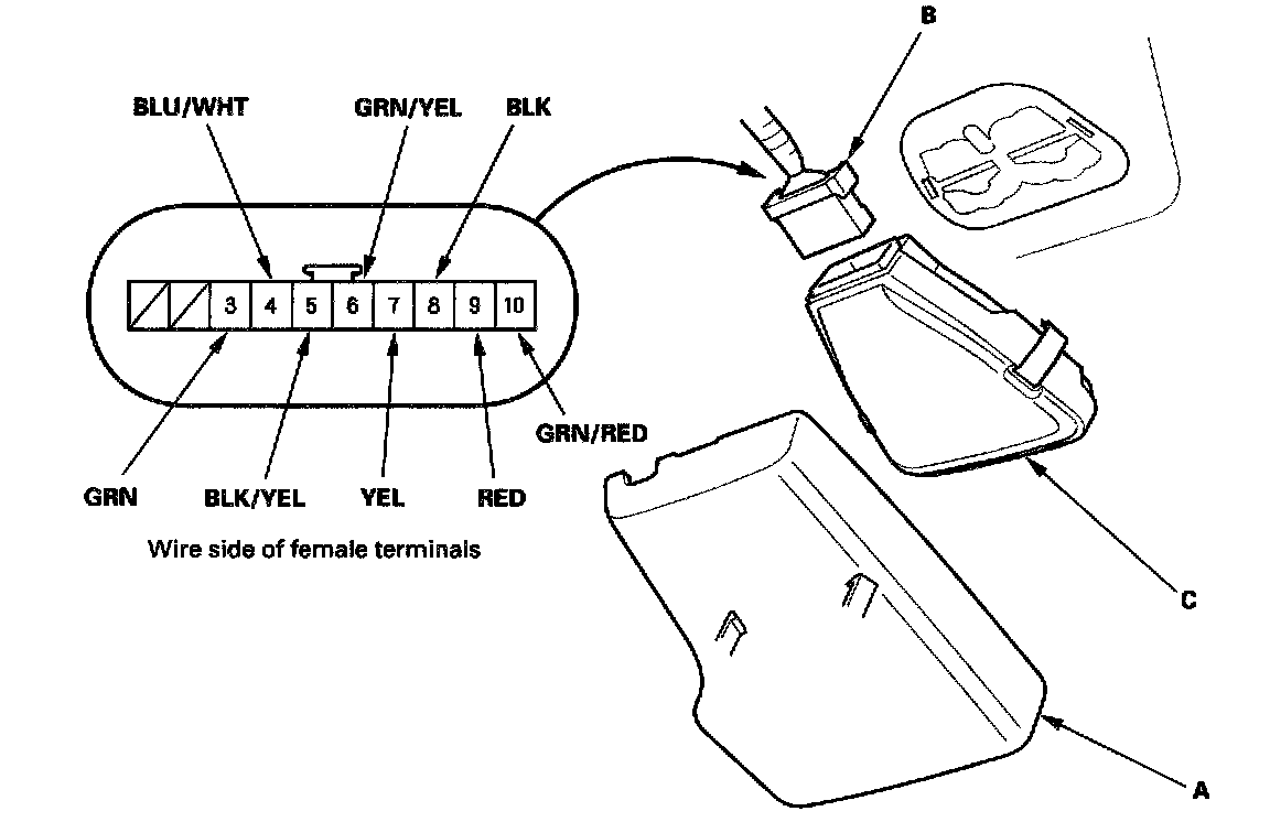 2. Disconnect the 10P connector (B) from the rain sensor/automatic wiper control unit(C).