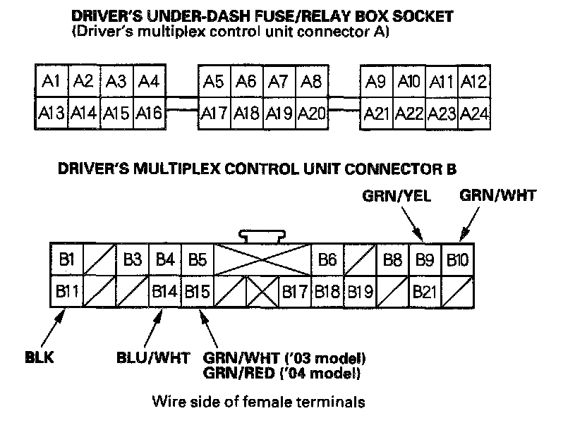 4. With the driver's multiplex control unit still disconnected, make these input tests at the connector and driver's under-dash fuse/relay box sockets