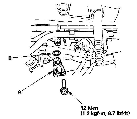 4. Install the sensor (A) in the reverse order of removal with a new O-ring (B).
