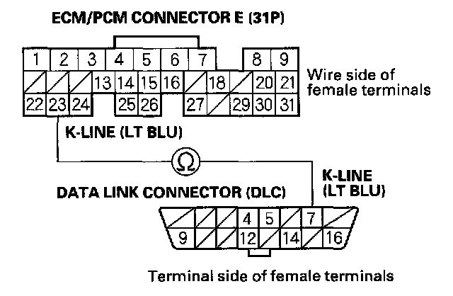 NO - Repair open in the wire between DLC terminal No.7 and the ECM/PCM (E23). After repairing the wire, check for a DTC with the scan tool or the HDS and go to the indicated DTC's troubleshooting.