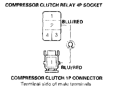 16. Check for continuity between the No.2 terminal of the compressor clutch relay 4P socket and the No.1 terminal of the compressor clutch 1P connector.