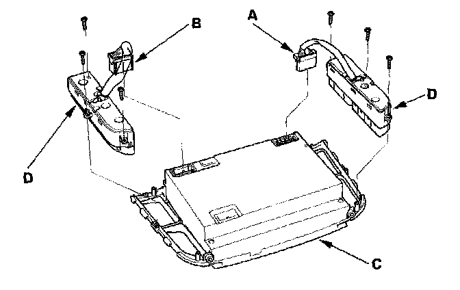 3. Disconnect 10P connector (A) and 16P connector (B) from the display panel control unit (C). Remove the self-tapping screws and the climate control switch assembly (D).