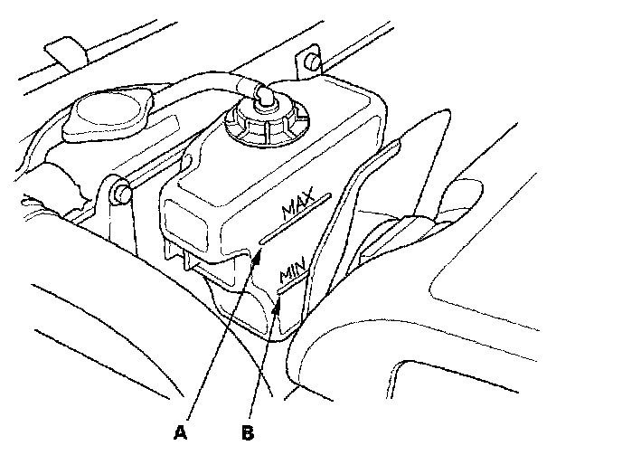 Coolant Check1. Look at the coolant level in the coolant reservoir. Make sure it is between the MAX mark (A) and MIN mark (B).