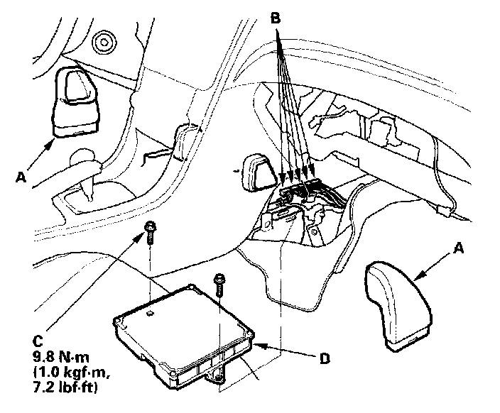 5. Remove the bolts (C), then remove the ECM/PCM (D).