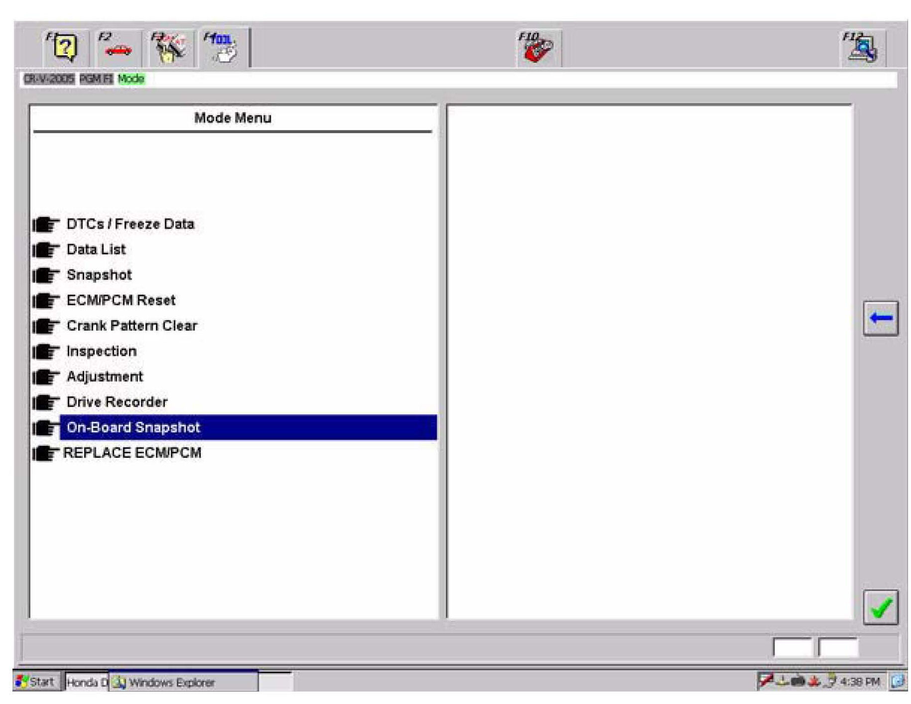 4. From the Mode Menu, select On-Board Snapshot. The HDS automatically pulls the data stored in the ECM/PCM and displays it on the display screen.