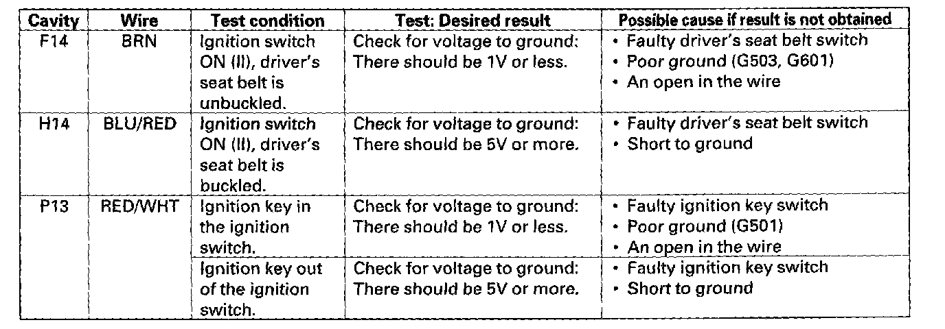 - If the beeper sounds and the seat belt reminder light flashes, go to step 14.