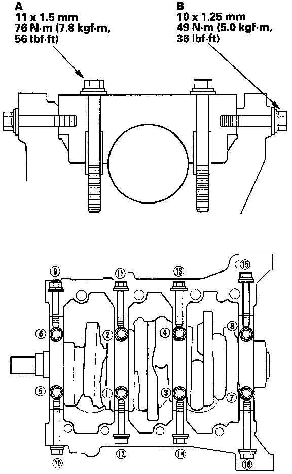 Tighten the bearing cap bolts (A), and then the bearing cap side bolts (B) to the specified torque in the sequence shown. Repeat the torque sequence again to assure the bolts are properly torqued.