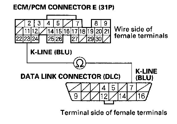 9. Check for continuity between DLC terminal No.7 and body ground.