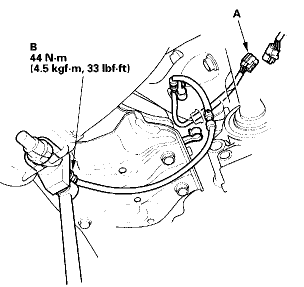 1. Disconnect the A/F sensor 4P connector (A), then remove the A/F sensor (B).