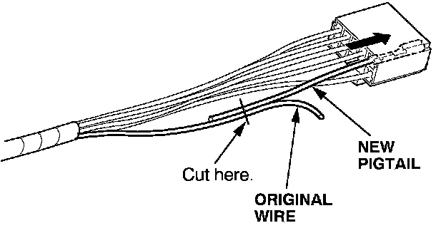 6. Lay the pigtail and the original wire side-by-side, and cut off both ends at once. If you are making more than one splice, do not cut each pigtail at the same location; the resulting "lump" of splice connectors would interfere with rewrapping the harness. Instead, cut the first pigtail close enough to the terminal so you will have room to make each remaining cut about 20 mm (3/4 inch) farther down on the next pigtail.