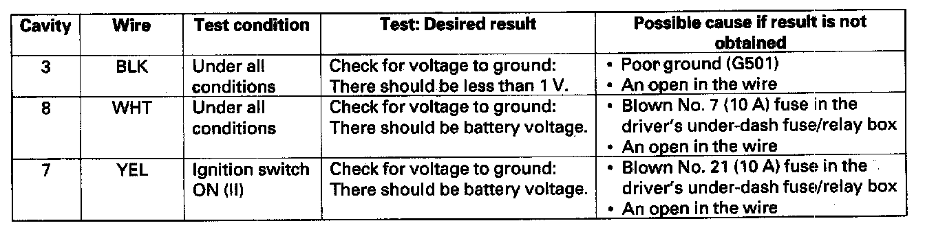 4. Reconnect the connector to the wiper/washer switch, and make these input tests at the connector.