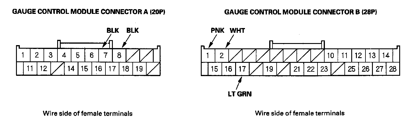 6. Disconnect the connectors to the gauge control module connector A (20P) and B (28P), and make these input tests at the connectors.